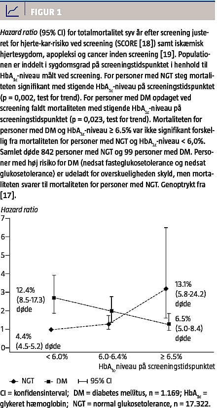 (rutinebehandling), eller til undervisning i intensiv behandling. Undersøgelsen er primært opgjort efter intention to treat-princippet med tæt på 100% opfølgning på primære endepunkter. Hvad betyder resultaterne for klinisk praksis? [17]: 1) at man ved én screeningsrunde uden rykkerskrivelse identificerer ca. 20% af de ikkeerkendte diabetikere, 2) at for hver person med diabetes, der blev fundet ved screening, identificeredes to med høj risiko for diabetes og seks uden diabetes, men med høj risiko for hjerte-kar-sygdom, 3) at kardiovaskulære risikofaktorer (vægt, rygestatus, blodtryk og kolesteroltal) var signifikant og markant forbedret fem år efter screeningstidspunktet i rutinebehandlingsgruppen og kun lidt bedre i den intensivt behandlede gruppe (Tabel 1). Intensiteten af farmakologisk behandling var høj i rutinebehandlingsgruppen og kun lidt højere i den intensivt behandlede gruppe (Tabel 1), 4) den beskedne forskel i behandlingskvaliteten mellem grupperne (Tabel 1) var associeret med 17% ikkesignifikant reduktion i første kardiovaskulære event i den intensivt behandlede gruppe sammenlignet med rutinegruppen (hazard ratio: 0,83, 95% konfidens-interval: 0,65-1,05), 5) en post hoc-analyse (Figur 1) viste, at de mest syge patienter med diabetes på screeningstidspunktet syv år senere havde en dødelighed, som ikke var forskellig fra dødeligheden i gruppen, som havde en normal glukosetolerans på screeningstidspunktet.
