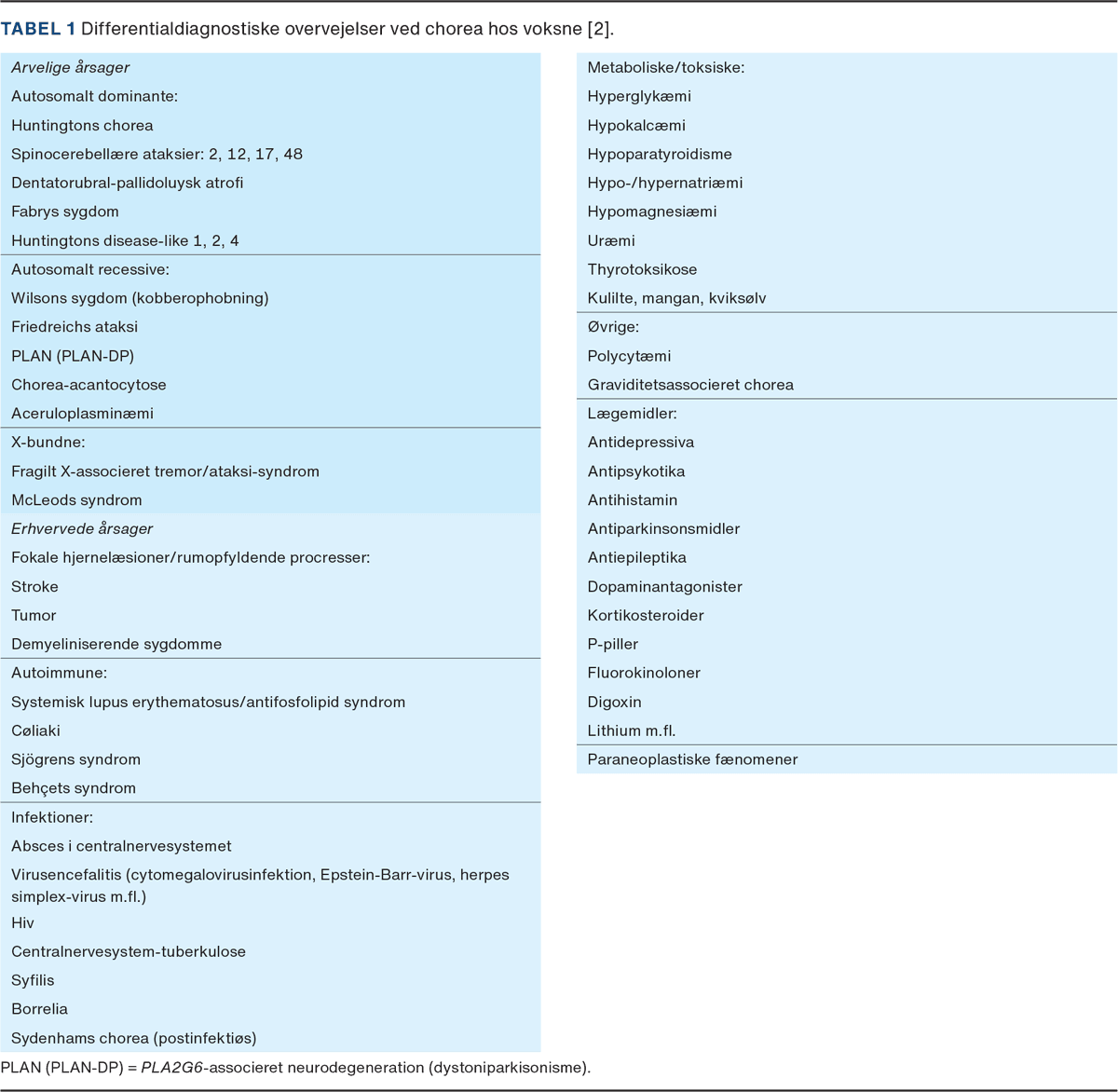Den primære mistanke var vaskulært betinget chorea (stroke). MR-cerebrum med kontrast viste dog kun diskrete kroniske iskæmiske forandringer. Hemichorea kan b.la. desuden ses postinfektiøst, som paraneroplastisk fænomen eller i forbindelse med neurodegenerative sygdomme som Huntingtons chorea (Tabel 1). Der var ingen anamnese med svære infektioner eller familiehistorie med neurologisk sygdom. Supplerende UL af abdomen var med moderat splenomegali på 17 cm. Lumbalpunktur med analyse af IgG og demensmarkører og biokemisk screening med HbA1c, thyroideastimulerende hormon, P-kobber, ceruloplasmin, IL-2 og ACE var alle med normalt resultat. Mængden af amyloid-beta-protein var let nedsat, hvilket kan ses som et aldersrelateret fænomen.