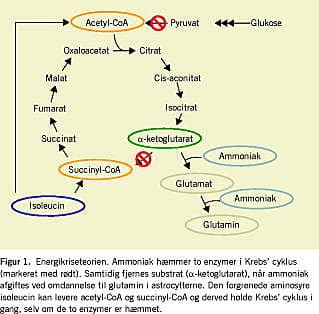 Nye magnetisk resonans-skannings-studier tyder på, at ammoniaks hæmning af hjernens glukoseomsætning kan være af betydning. I en aktuel dansk hypotese fokuseres der på ammoniaks påvirkning af hjernens energistofskifte ved direkte hæmning af specifikke enzymer i Krebs' cyklus (Figur 1 ) [3]. Denne »energikriseteori« er attraktiv, fordi den kombinerer leversygdom, forhøjet blodammoniak, hjerneforstyrrelse og et afprøvet behandlingsprincip med forgrenede aminosyrer. Disse ideer afprøves nu i et translationelt forskningssamarbejde, hvori man kombinerer dyrkede astrocytter og neuroner med PET-undersøgelser af hjernens energistofskifte hos cirrosepatienter. De første resultater fra dyrkede celler viser, at forhøjet ammoniak accelererer glykolysen, og at forgrenede aminosyrer kan indgå i hjernens energistofskifte [4].