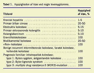 I hepatologien er kløe et vigtigt symptom. Hepatisk kløe kan forekomme ved alle leversygdomme, men ses fortrinsvis ved de tilstande, der er nævnt i Tabel 1 . Den moderne definition af kløe (pruritus) stammer fra 1660, hvor Hafenreffer karakteriserede kløe som en ubehagelig fornemmelse i huden, der giver trang til at klø (eller kradse) [1]. Englænderne er måske sprogligt bedre stillet end danskerne, fordi de kan skelne mellem itch (kløe, altså en fornemmelse) og scratch (kløadfærden eller kradse).