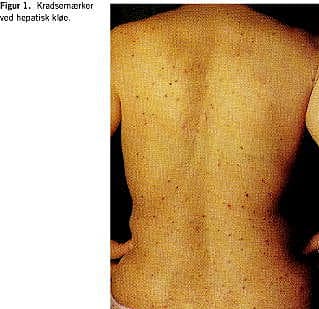 Diagnosen hviler på patientens beskrivelse. Objektive fund kan mangle, eller der kan ses kradsemærker over hele kroppen bortset fra et sommerfugleformet område omkring skulderbladene, hvor patienten ikke kan nå (Figur 1 ). Selv om den rutinerede hepatolog måske til en vis grad kan skelne hepatisk kløe fra andre typer kløe, er der ingen sikre patognomoniske karakteristika, så hvis sammenhængen mellem symptomet og leversygdommen ikke er oplagt, må alternative årsager til kløen overvejes (f.eks. scabies og andre kløende hudsygdomme, lymfom og anden malignitet, uræmisk kløe, polycytæmia vera, thyroideasygdomme samt indtag af medikamenter og naturmedicin).