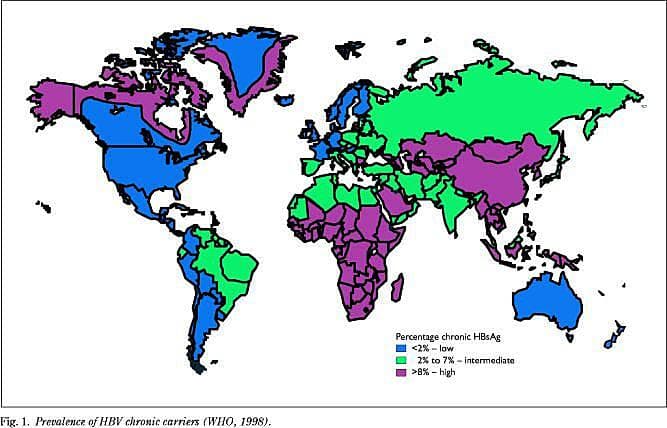Der er en tæt korrelation i geografisk distribution mellem HBV (Fig. 1) og HCC (1, 2). Den udtalte globale variation i forekomst af HBV-markører er epidemiologisk set et af de mest karakteristiske træk ved en HBV-infektion. Forskellen i prævalens imellem lav- og høj-prævalensområder kan variere op til 20-50 gange. I to regioner er prævalensen på 10% eller mere, i Afrika syd for Sahara og i Sydøstasien. Nordafrika, Mellemøsten og den resterende del af Asien har en prævalens på 2-5%. Sydamerika, Sydeuropa og den europæiske del af det tidligere Rusland har en prævalens på 1-2%, og i lande som USA, Vesteuropa, Australien og New Zealand er prævalensen 0,2-0,5%. Den højeste prævalens af HBV falder sammen med den højeste prævalens af HCC i Afrika syd for Sahara og Sydøstasien, den intermediært forekommende prævalens af både HBV og HCC forekommer i Sydeuropa og Japan og den laveste prævalens i USA og Vesteuropa (1, 2).
