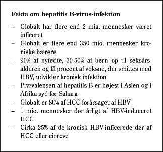 Infektion med hepatitis B-virus (HBV) kan udvikle sig til en kronisk virusbærertilstand, som kan medføre kronisk hepatitis, cirrose og hepatocellulært karcinom (HCC). I sjældne tilfælde udvikler bærertilstanden sig direkte til HCC, uden intermediær kronisk hepatitis eller cirrose (1). HBV var et af de første virus, for hvilke man påviste en sammenhæng mellem en virusinfektion og tumor hos mennesker. HBV skønnes at forårsage 80% af HCC (2, 3) og anses sammen med tobak for at være en af de vigtigste miljørelaterede karcinogener. Det estimeres, at mere end 350 mio. mennesker er bærere af HBV (4), og at op til 25% af dem vil udvikle HCC (5). HCC er globalt set en af de hyppigst forekommende maligne sygdomme (6) og forårsager årligt 1 mio. dødsfald (4).