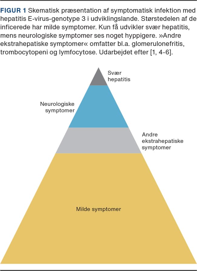 Infektion med HEV er i de fleste tilfælde asymptomatisk, og kun hos meget få udvikles der akut leversvigt [1]. Blandt symptomatiske patienter med erkendt HEV-infektion er der beskrevet neurologiske manifestationer hos 8-30% [4-6] (Figur 1). Selvom smitte med HEV har været mere hyppig tidligere, er det først i de senere år, at man er blevet opmærksom på associationen med neurologisk sygdom. Formålet med denne artikel er at gennemgå de neurologiske manifestationer, der kan forekomme ved HEV-infektion.