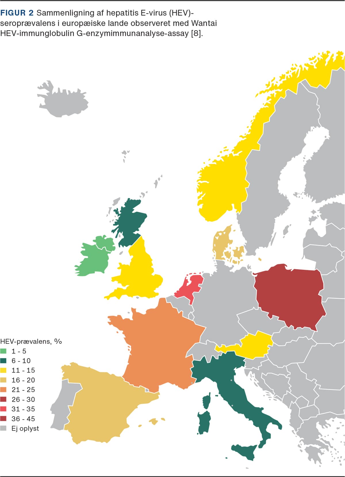 Et prævalensstudie blandt danske bloddonorer fra 2013 viste positiv anti-HEV-immunglobulin (Ig) G hos 20%, når det mest sensitive assay blev benyttet [3], og der er påvist en endnu højere seroprævalens blandt danske svineavlere [2]. En oversigt over HEV-seroprævalens i Europa er vist i Figur 2.