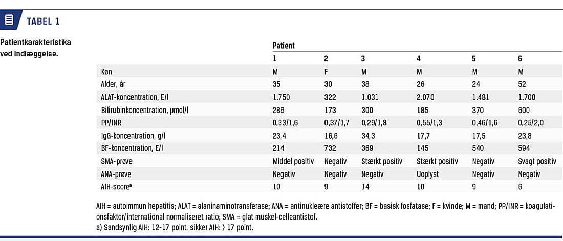 Seks patienter af somalisk herkomst blev indlagt på mistanke om AIH. Patienterne havde gastrointestinale symptomer, ikterus og svær leverpåvirkning (Tabel 1). En (patient nr. 6) havde encefalopati og levercirrose. Fem af patienterne var mænd i alderen 24-52 år. Alle havde haft et khatforbrug forud for symptomdebuten. Paraklinisk sås der betydelig forhøjelse af alaninaminotransferase (ALAT)-niveauet, forhøjet IgG-niveau, koagulopati og hyperbilirubinæmi. Screening for viral hepatitis og andre kendte årsager til leverpåvirkning var negativ.