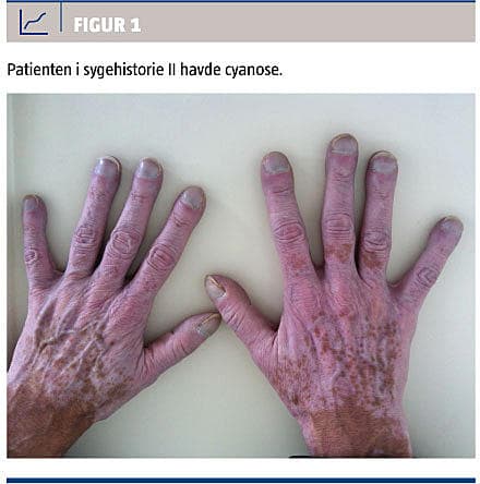 Patienten havde cirrosestigmata, clubbing og cyanose (Figur 1). Ved en ekkokardiografi med saltvandsmikrobobler blev der påvist intrapulmonale shunter, hvilket var foreneligt med HPS. Den kliniske tilstand var kronisk dårlig, idet hun var afhængig af ilt døgnet rundt og havde et lavt funktionsniveau. Levertransplantation kom ikke i betragtning pga. af hendes ukorrigerbart store alkoholforbrug.