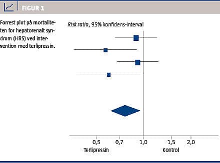 I flere randomiserede kliniske forsøg med vasokonstriktorer til HRS er effekten af terlipressin plus albumin blevet undersøgt. Når resultaterne samles i en metaanalyse, finder man, at terlipressin kombineret med albumin reducerer mortaliteten og forbedrer nyrefunktionen hos patienter med HRS type 1 (Figur 1) [15]. Med de nuværende diagnostiske kriterier er behandlingen effektiv hos op til 40% af patienterne [16]. Der foreligger kun sparsom evidens for behandling af HRS type 2. De foreløbige resultater er ikke lovende, men de enkelte forsøg har for få patienter til, at man kan udelukke en sikker gavnlig effekt. I enkelte mindre forsøg har man sammenlignet effekten af terlipressin med effekten af andre vasokonstriktorer, specielt noradrenalin. Da forsøgene har en lav statistisk styrke, er det er ikke muligt at vurdere, om andre vasokonstriktorer er lige så effektive som terlipressin. Bivirkninger ved terlipressin ses hos ca. 30% af patienterne og medfører pausering af behandlingen hos 4%. Bivirkningsprofilen afspejler terlipressins vasokonstriktoriske effekt. De fleste patienter oplever milde grader af perifer iskæmi i form af cyanotiske fingre og tæer. Hos enkelte patienter er der imidlertid rapporteret om iskæmisk nekrose. Arytmier, oftest bradykardi, ses hos ca. 7% af patienterne. 16% får mavesmerter og diare, formentlig på grund af splanknisk iskæmi. Der er registreret et enkelt tilfælde af intestinal iskæmisk nekrose [12]. Kontraindikationer til behandling med terlipressin er iskæmisk hjertesygdom, kardiomyopati, ukontrolleret arytmi, svær arteriel hypertension og svær aterosklerose i ekstremiteter. Terlipressin bør anvendes med forsigtighed hos patienter med astma og kronisk obstruktiv lungelidelse.