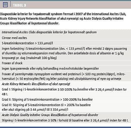 S-kreatininkoncentrationen skal overstige 133 mikromol/l for at kriterierne for HRS er opfyldt. Denne praksis kan medføre overestimering af den reelle nyrefunktion, fordi patienter med cirrose ofte har reduceret S-kreatininkoncentration som følge af deres leverlidelse, malnutrition og nedsatte muskelmasse [19]. I 2007 opstillede Acute Kidney Injury Network (AKIN) nye kriterier for klassifikationen af akut nyresvigt [20] (Tabel 3). Det er muligt, at denne klassifikation vil være en forbedring af vurderingen af nyrefunktionen hos patienter med cirrose, da den er mere sensitiv over for små ændringer i S-kreatininkoncentrationen end den tidligere klassifikation. Acute Dialysis Quality Initative Group foreslår en ny klassifikation, kaldet Hepatorenal Disorder, som er udviklet med udgangspunkt i de kriterier for nyresvigt, som er angivet af AKIN (Tabel 3) [16]. I observationelle studier af patienter med cirrose og ascites har man fundet, at beskedne ændringer i nyrefunktionen vurderet ved AKIN-klassifikationen ofte progredierer og prædikterer mortalitet, infektion og muligvis HRS [21-24]. Der er dog endnu ikke studier, som viser, om anvendelse af AKIN-kriterierne forbedrer patienternes samlede prognose.
