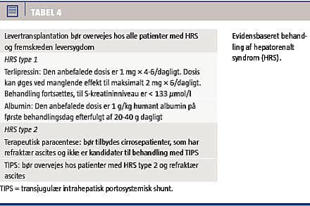 HRS er en hyppig og alvorlig komplikation i forbindelse med cirrose og ascites. Selv små ændringer i S-kreatininniveau kan være væsentlige og have stor betydning for udvikling af HRS og død. En række velkendte faktorer kan udløse HRS. Forebyggelse og korrekt behandling af disse reducerer risikoen for udvikling af HRS. Til HRS type 1 er den bedst dokumenterede behandling kombinationen af terlipressin og albumin. Ved HRS type 2 med gentagne behov for paracentese bør patienten vurderes med henblik på TIPS-anlæggelse eller levertransplantation.