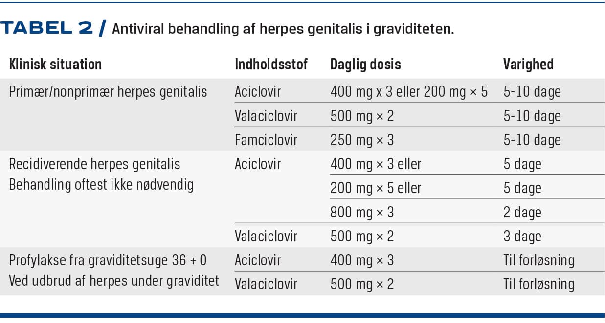Gravide med primær eller nonprimær herpes genitalis anbefales antiviral behandling snarest efter sygdomsudbrud for at reducere sygdomsvarigheden og sværhedsgraden. Behandlingen nedbringer desuden virusudskillelsen [16, 17]. Aciclovir er førstevalg til behandling af gravide og betragtes som sikkert at anvende i alle trimestre [18-20] (Tabel 2). Ved primær infektion i tredje trimester fortsættes behandlingen frem til fødslen. Alvorlig systemisk infektion behandles intravenøst med medicin efter samme retningslinjer som for ikkegravide. Alternative præparater er valaciclovir og famciclovir, men data om anvendelse i graviditeten er begrænsede, og produkterne er derfor hhv. andet- og tredjevalg [18].