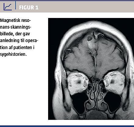 Pga. følelsesløshed og prikken under højre fod og senere bilateralt i arme og balder samt intermitterende svimmelhed blev en 37-årig kvinde vurderet af en neurolog. En magnetisk resonans (MR)-skanning afslørede en 3 cm stor tumor frontalt i subaraknoidalrummet uden sikker relation til meninges eller cerebrum samt 11 mindre tumorer, alle < 1 cm, under dura mater og langs falx cerebri (Figur 1). Tentativ diagnose var meningeomer, men pga. tumorernes atypiske udseende fandt man indikation for operation, den største tumor blev excideret, og symptomerne svandt. Histologisk diagnose var HO med trilaminær hæmatopoiese, en benign knogletumor. Patienten blev henvist til et endokrinologisk ambulatorium, hvor man fandt normale koncentrationer af P-calcium, fosfat, parathyroideahormon, 25-hydroxyvitamin D, osteocalcin og kreatinin. Koncentrationen af basisk fosfatase var normal, men koncentrationen af knoglespecifik basisk fosfatase var grænseforhøjet på 40 U/l (referenceværdi: 10-35 U/l). En knoglescintigrafi viste normale forhold bortset fra inhomogen knogleomsætning i os frontale på operationsstedet. Der var ingen tegn på HO i bindevævet og ingen hovedtraumer i anamnesen. Der blev ikke indledt farmakologisk behandling, og patienten blev fulgt med årlige kontrol-MR-skanninger for at observere eventuel vækst.