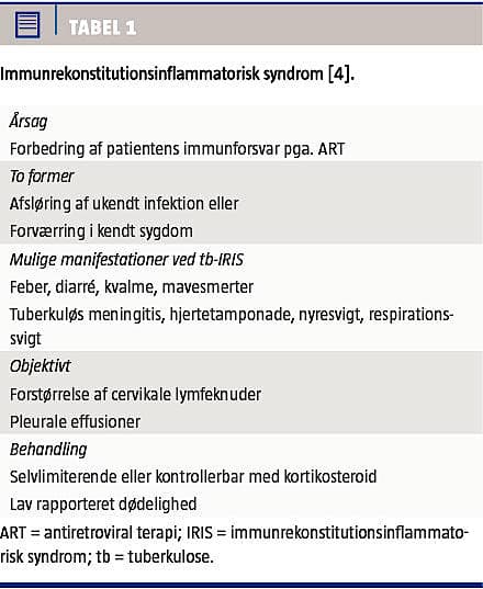 Tidlig ART er ikke problemfrit, da man risikerer, at en eventuelt gavnlig effekt opvejes af en eventuelt højere risiko for immunrekonstitutionsinflammatorisk syndrom (IRIS) (Tabel 1), hvilket er en kendt komplikation, når en patient starter ART. Kendte risikofaktorer for udvikling af IRIS er lavt CD4+-T-celletal (CD4+), dissemineret eller ekstrapulmonal tb og kort interval mellem start af behandling for en given opportunistisk infektion og ART [5].