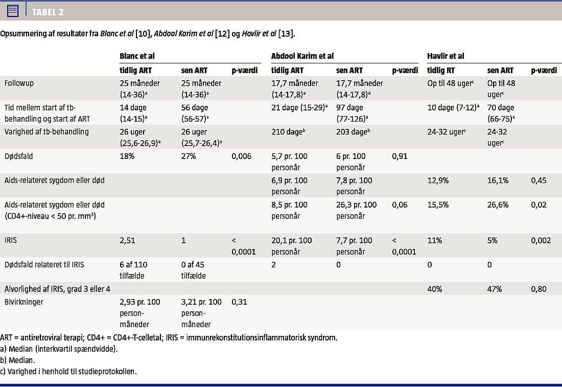 nifikant lavere såvel dødelighed som aids-relateret sygdom i tidlig ART-gruppen end i sen ART-gruppen, 3) risikoen for IRIS var signifikant højere i tidlig ART-gruppen end i sen ART-gruppen, men der var ingen signifikant forskel, hvad angik alvorligheden af IRIS, og 4) IRIS førte ikke til nogen dødsfald. Resultaterne fra de tre studier [10, 12, 13] er opsummeret i