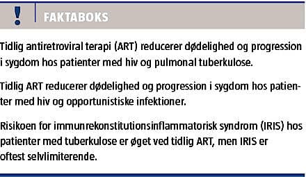 De danske retningslinjer for behandling af tb hos hiv-positive patienter findes i »Tuberkulosebekæm-pelse i Danmark, et nationalt tuberkuloseprogram« fra 2010 [9]. Her står, at »studier fra Sydafrika tyder på, at der sker en reduktion af mortaliteten ved at indlede ART så hurtigt som muligt, og de forventede bivirkninger i form af øget forekomst af IRIS er mindre end frygtet«.