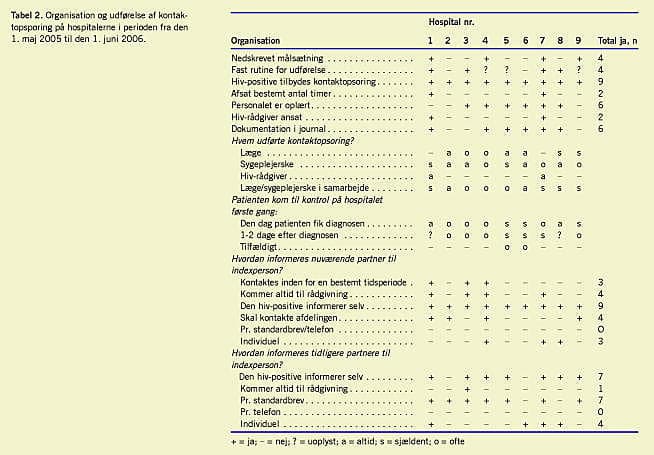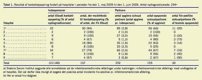 Konklusion: Kontaktopsporing blev udført hos under halvdelen af de nydiagnosticerede hiv-positive. Hver fjerde opsporede partner var hiv-positiv uden at vide det. Kontaktopsporing udføres meget forskelligt på de danske hospitaler. Der er behov for en intensiveret og ensartet kontaktopsporingsindsats.