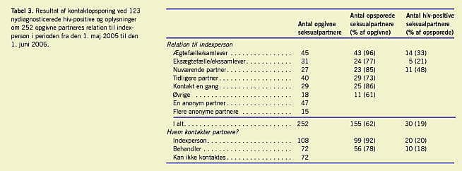 Kontaktopsporing blev tilbudt til 123 indexpersoner. Der var 107 indexpersoner, der ville medvirke til kontaktopsporing. Hos de 16 indexpersoner, der ikke ønskede at deltage, var årsagen uoplyst. Der blev i alt opgivet 252 partnere dvs. i gennemsnit 2,4 partnere pr. indexperson, der deltog i kontaktopsporing. De, som var blevet rådgivet om smitteveje, sikker sex, postekspositionsprofylakse (PEP) og § 252 (en hiv-smittet, der udsætter sin partner for smitte med hiv, kan straffes, hvis partneren ikke ved, at der er en risiko for at blive smittet) opgav fire gange så mange partnere pr. indexperson som de, der ikke fik rådgivning om disse emner. Der blev i alt opsporet 155 partnere, dvs. at der i gennemsnit blev opsporet 1,4 partnere pr. indexperson, der deltog i kontaktopsporing. Den primære årsag til, at partnere ikke blev opsporet, var, at personen var bosiddende i udlandet, eller at det drejede sig om anonyme kontakter. De opgivne partneres relation til indexpersonen fremgår af Tabel 3. Resultatet af kontaktopsporing fordelt på hospitalerne fremgår af Tabel 1. Af de opsporede partnere blev 126 (81%) hiv-testet. Der blev i alt fundet 30 nye hiv-positive. Dette var i gennemsnit 0,28 ny hiv-positiv pr. indexperson, der deltog i kontaktopsporing. Der var 12 (40%) af de 30 nye hiv-positive, der påbegyndte antiviral behandling for hiv ved konstatering af hiv-diagnosen.