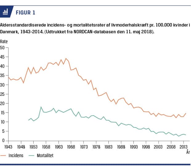 papillomvirus (hrHPV)-analyse for 60-64-årige [1]. Screeningsprogrammet har medført et væsentligt fald i incidensen og mortaliteten af livmoderhalskræft, men i de seneste 15 år er antallet af livmoderhalskræfttilfælde stagneret, hvilket sandsynligvis væsentligst skyldes lav deltagelse og dækningsgrad (Figur 1) [2, 3] og muligvis også den velkendte sociale ulighed i deltagelsen [4, 5]. Den seneste opgørelse fra Dansk Kvalitetsdatabase for Livmoderhalskræftscreening viser, at 74% af målgruppen er blevet undersøgt inden for de seneste 3,5 år (23-49-årige) og 5,5 år (50-64-årige) [6]. Kvinder, der ikke er blevet undersøgt inden for screeningsintervallet, inviteres. Deltagelsen et år efter invitation er 64% på landsplan [6].
