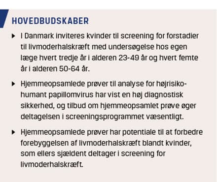 I denne artikel redegøres der for den eksisterende litteratur, inkl. nyere danske forskningsresultater, om anvendeligheden af hjemmeopsamlede prøver til undersøgelse for hrHPV med særligt fokus på øget screeningsdeltagelse og komplians til opfølgende udredning med henblik på at forbedre forebyggelsen af livmoderhalskræft.
