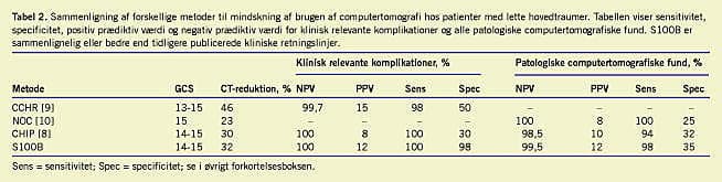 Seks studier, som indbefattede næsten 2.000 prospektivt inkluderede patienter, hvor S100B er anvendt til visitation af patienter med lette hovedtraumer, har vist, at S100B kan anvendes til at selektere patienter, som ikke behøver CT eller indlæggelse (3-8). NPV (med S100B < 0,10 mikrogram/l inden tre timer efter traumet) er over 99,5% for alle patologiske CT-fund og 100% for klinisk relevante CT-fund med behov for neurokirurgisk intervention (Tabel 1). Ved hjælp af S100B kan man teoretisk reducere CT-anvendelsen med over 30% med uændret patientsikkerhed. Disse tal er sammenlignelige - om ikke bedre - end de tidligere nævnte nyere kliniske retningslinjer (Tabel 2). S100B er desuden fri for subjektive tolkningsfejl og påvirkes ikke af alkoholindtag ved hovedtraume [6].