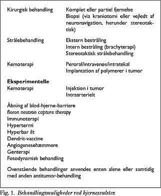 Behandling af primære hjernetumorer omfatter kirurgi, strålebehandling og kemoterapi. I Fig. 1 er der anført såvel anerkendte som eksperimentelle behandlinger; sidstnævnte vil kort blive omtalt senere. Af de nævnte behandlinger er kun strålebehandling dokumenteret i klinisk kontrolleret undersøgelse.