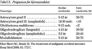 Prognosen fremgår af Tabel 2 . Resultaterne i Danmark adskiller sig ikke fra resultaterne internationalt (17). De væsentligste faktorer af betydning for prognosen er: 1) alder (højere/dårligere), 2) gradering af tumor (højere/dårligere), 3) tumortype og 4) patientens kliniske status (lavere/dårligere), hvilket naturligvis har betydning for den strategi, man vælger. Alder >60 år er ikke alene et dårligt prognostikum for overlevelse ved en malign hjernetumor, men giver også øget risiko for bivirkninger af behandlingen. En undersøgelse tyder på en sammenhæng mellem ventetid til strålebehandling og prognose (18). Om dette også gælder for kirurgisk behandling eller kemoterapi er endnu ikke undersøgt.