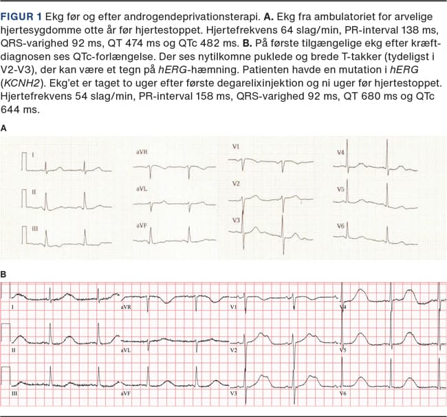 Prostatakræft er en af de mest almindelige kræfttyper blandt mænd, og ved metastasering er kemisk kastrering ved hjælp af androgendeprivationsterapi central i behandlingen [1]. Visse af disse præparater kan øge varigheden af QT-intervallet [2]. Langt QT-syndrom (LQTS) er en sjælden, arvelig hjertesygdom, men mandlige patienter med LQTS vil fra tid til anden blive diagnosticeret med metastatisk prostatakræft. I disse tilfælde er det vigtigt at være opmærksom på risikoen for yderligere QT-forlængelse og dermed øget risiko for letale arytmier [3].
