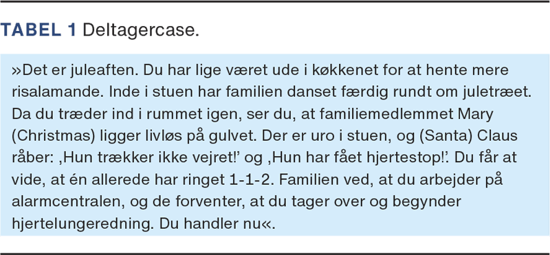Deltagerne repræsenterede en bred population af sundhedspersonale med eksponering af ambulancebehandlere (33%), læger (24%), ambulancebehandlerelever (19%), medicinstuderende (14%) og paramedicinere (10%). Den gennemsnitlige alder var 35 år (23-63 år), mens det mandlige køn var hyppigst repræsenteret (76%). Næsten alle deltagere havde udført HLR på en patient (86%), mens de færreste havde givet HLR på en juleaften (14%).