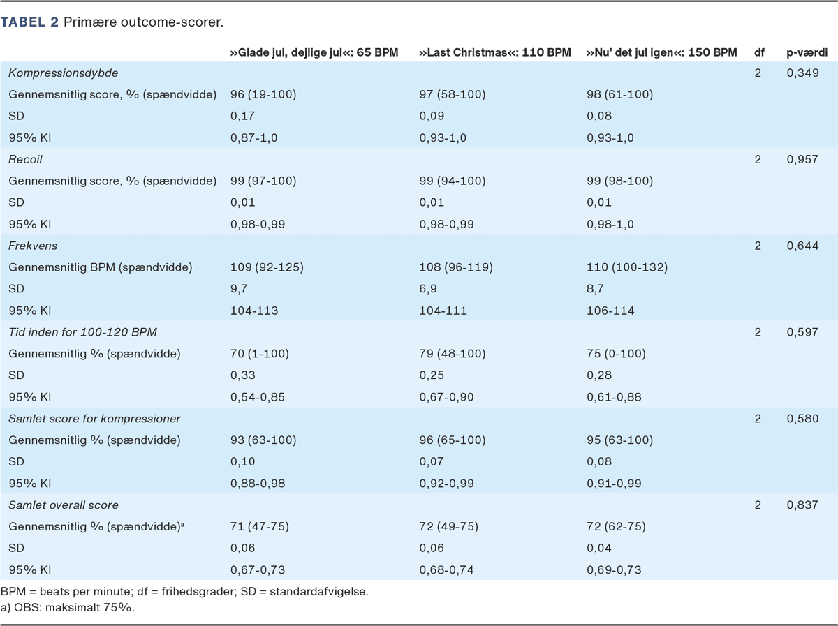 Den gennemsnitlige score for kompressionsdybde var høj for alle tre julesange (96%, 97% og 98%), og lave standardafvigelser indikerede en ensartethed på tværs af deltagere (Tabel 2). Scoren for kompressionsdybde gav høj score ved opnåelse af minimum 50 mm, men der blev ikke fratrukket point ved for dyb kompression. Den gennemsnitlige dybde for »Glade jul, dejlige jul« var 72,1 mm, mens den var 75,1 mm og 75,9 mm for hhv. »Last Christmas« og »Nu det jul igen«. Deltagerne viste en høj og konsistent recoil af thorax-score på tværs af sangene (99% for alle tre sange). Den gennemsnitlige frekvens af kompressioner lå på 108-110 BPM med en moderat variation (standardafvigelse (SD): 6,9-9,7). Andelen af tid med korrekt frekvens var højest for »Last Christmas« (79%), mens »Glade jul, dejlige jul« lå lavest i gennemsnit (70%). Den samlede score for kompressioner var generelt høj med gennemsnitligt 93-96%. Den samlede overall score (maksimalt 75% muligt), lå på 71-72% med lav variation (SD: 0,04-0,06). Ingen af parametrene fremviste statistisk signifikant forskel mellem sangene (Tabel 2).