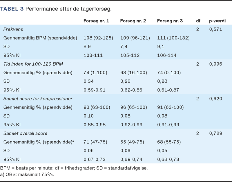Statistiske udregninger blev udført for at undersøge, om deltagerne præsterede bedre på deres sidste forsøg end deres første. Den gennemsnitlige frekvens steg fra 108 til 111 BPM, men var ikke statistisk signifikant (Tabel 3). Den samlede score for kompressioner var højest i andet forsøg (96%), mens den overordnede score var højest i første forsøg (71%) og lavere i de efterfølgende forsøg. Der var ikke statistisk signifikante tegn til, at deltagerne præsterede forskelligt afhængig af forsøgets rækkefølge (Tabel 2).