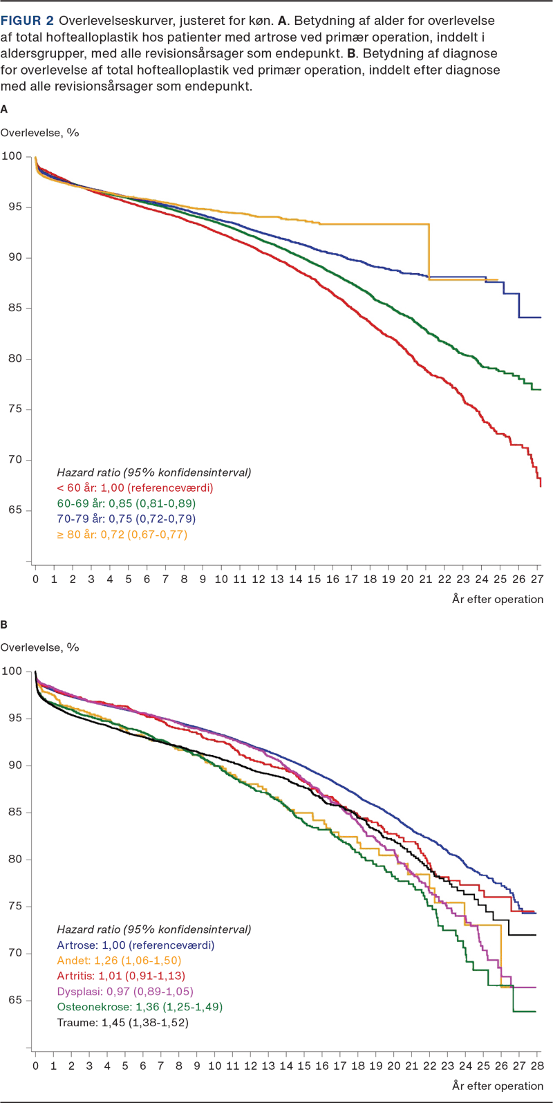 Alder og indikation for operationen er veldokumenterede faktorer med betydning for holdbarhed (Figur 2). Ser man på den overordnede proteseoverlevelse i Danmark på tværs af diagnoser og revisionsårsager, er denne 95% efter fem år og 76% efter 25 år [9]. Således vil 76% stadig have deres THA efter 25 år, og det vides ikke, hvor længe herudover protesen kan holde. For praktiske formål betyder det, at protesen ved operation af patienter over 60 år kan forventes at holde livet ud i langt de fleste tilfælde.