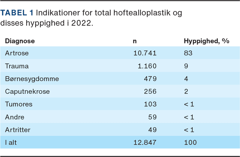 Der findes andre mindre hyppige indikationer for THA (Tabel 1): I 2022 var indikationen for primær THA i 9% af tilfældene hoftenær fraktur. Mere sjældne indikationer for THA (< 3%) inkluderer acetabulær dysplasi, caputnekrose og artritis [9]. Artritis som indikation er dog reduceret væsentligt de seneste årtier grundet biologisk behandling [10].