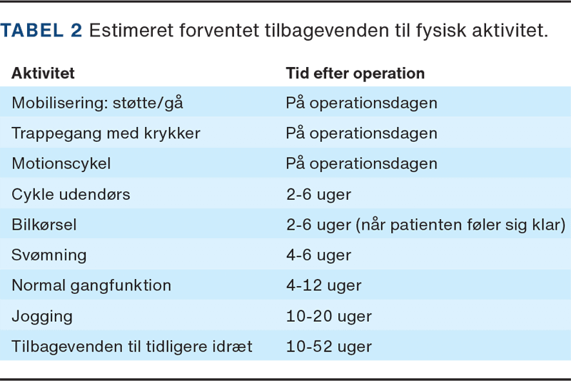 Efter operation mobiliseres patienten hurtigst muligt og udskrives typisk samme dag eller dagen efter operation under dække af smertestillende medicin, herunder morphin eller morphinlignende præparater. Bevægerestriktioner er ikke anbefalet efter operation [14], selvom det traditionelt er blevet anbefalet i 6-12 uger med begrænset bevægelse efter THA-operation for at reducere risikoen for luksation. Ifølge den eksisterende litteratur medfører anbefaling om bevægerestriktioner ubetydelig forskel i luksation. Ændringer i anvendte protesekomponenter formodes at have bidraget til reduktion af risikoen for luksation. Nærmere detaljer vedrørende genoptræning er uden for formålet med denne artikel, og vi henviser i stedet til Hansen et al [18].