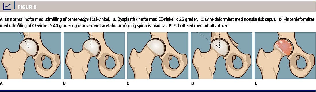 Overordnet er der to typer FAI. Ved CAM (Figur 1B) sidder forandringerne på caput/collum femoris, og ved Pincer (Figur 1C) sidder forandringerne på acetabulum. Diagnosen stilles ved udmåling af flere vinkler på røntgenoptagelser, MR-skanning eller CT. Ved Pincer-FAI er CE-vinklen større end 39 grader [2]. Hvis der ikke er artrose i hofteleddet, vil den kirurgiske behandling være hofteartroskopi med knogleresektion og evt. reinsertion af labrum [14].