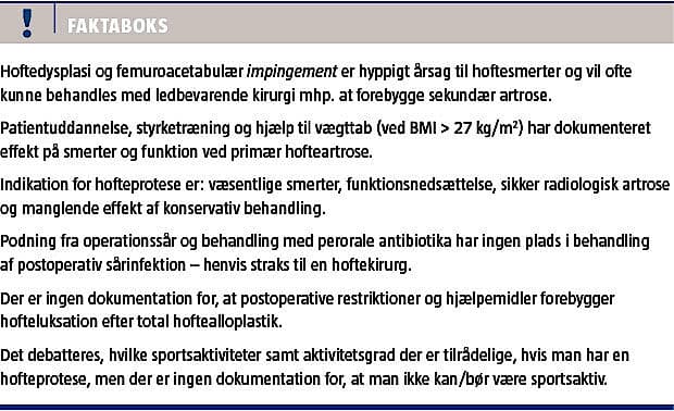 Hip dysplasia and femoroacetabular impingement are frequent causes of hip pain and can often be treated with joint preserving surgery to prevent secondary osteoarthritis (OA). Patient education, progressive resistance training and weight loss at a BMI > 27 kg/m2 has documented effect on pain and function in primary hip OA. If wound infection occurs after total hip arthroplasty the patient should not be treated with peroral antibiotics but instead be referred to an orthopaedic surgeon. There is no documentation that post-operative movement restrictions prevent dislocation of hip after total hip arthroplasty.