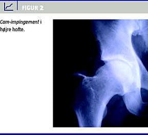 De radiologiske fund ved cam-impingement (engelsk for knastaksel) er karakteriseret ved ophævet eller formindsket offset af den anterolaterale del af collums metafyse: Caput er nonsfærisk. Dette formodes at være en præartrosetilstand, der ses hos yngre med tiltagende randudbygninger på især caput-collum-overgangen og på kanten af acetabulum [15, 16]. Hyppigst er der forandringer både på caput-collum-overgang og acetabulum [18] (Figur 2 ). Ved maksimal fleksion og indadrotation er der formindsket »frihed" mellem collum femoris og acetabulum. Her kan der komme en påvirkning over tid af brusken på kanten af acetabulum, og den løsnes. Det kan efterhånden medføre en fuldstændig afløsning af brusken og labrumskade [19]. Cam -deformitetens omfang bestemmes ved Nötzlis α-vinkel, hvor en vinkel på over 55° i det koronale plan er patologisk [20].