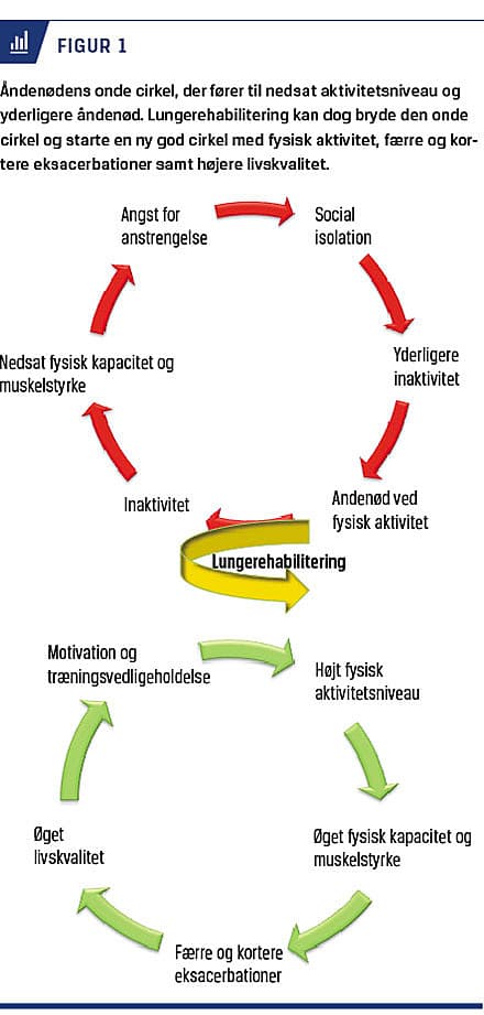 Det er påvist, at patienter med KOL har lavere aktivitetsniveau end deres raske jævnaldrende, og at de ofte nedsætter deres aktivitetsniveauer i takt med sygdommens forværring [2]. Lungerehabilitering tilbydes med det formål at bryde den onde cirkel, der startes af anstrengelsesudløst åndenød og følgende fysisk inaktivitet, hvilket leder til fysisk dekonditionering, angst, social isolation, yderligere inaktivitet og mere åndenød (Figur 1).