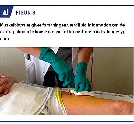 En klinisk betydende konsekvens af KOL er skeletmuskeldysfunktion og tab af skeletmuskulatur, hvilket medfører nedsat muskelstyrke primært i underekstremiteterne. Hos patienter med KOL er årsagen til skeletmuskeldysfunktion formentlig en kombination af fysisk inaktivitet, kronisk inflammation, oxidativt stress, steroidbehandling, hypoksæmi og hyperkapni [18]. Da lav muskelstyrke er påvist at prædiktere mortalitet ved KOL, regnes det for en vigtig prognostisk faktor (Figur 3) [19].