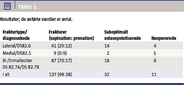 I gruppen med bi- eller trimalleolære frakturer var 23,5% (4/17) af de pronationsbetingede frakturer suboptimalt opereret, heraf blev to reopereret.