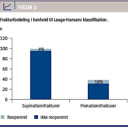 Opdeles frakturerne iht. Lauge-Hansens klassifikation, findes 99 supinationsfrakturer og 38 pronationsfrakturer (Figur 1). Ud af 137 frakturer fandt vi i seks tilfælde oplagte fejlklassifikationer i henhold til Lauge-Hansens klassifikationssystem. I alle tilfælde drejede det sig om pronationsfrakturer, der var fejlklassificeret som supinationsskader. I to tilfælde var det fejlklassifikationen, der i væsentlig grad betingede reoperationen.
