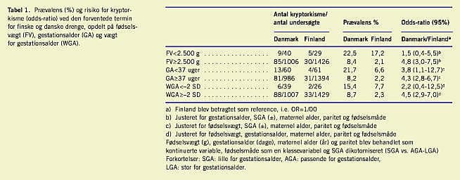 Samlet havde danske drenge en højere risiko for kryptorkisme end finske drenge, såvel ved den forventede termin (OR 4,0 (2,7-6,0, p< 0,0001)) som i tremånedersalderen (OR 2,0 (1,0-3,1, p= 0,057)). Efter justering for fødselsvægt, gestationsalder, SGA, paritet, maternel alder og fødselsmåde fandt vi en OR på 4,4 (2,9-6,7, p< 0,0001) ved fødslen og 2,2 (1,1-4,6, p= 0,032) i tremånedersalderen. Vi fandt en særlig høj OR ved fødslen blandt danske drenge med normal fødselsvægt (p< 0,0001), fødsel til termin (p< 0,0001) og normal vægt for gestationsalder (p< 0,0001) sammenlignet med finske drenge (Tabel 1). Ved tremånedersundersøgelsen var OR fortsat signifikant forhøjet blandt danske drenge med normal fødselsvægt (OR 2,4 (1,1-5,1, p= 0,028)) og fødsel til termin (OR 2,8 (1,2-5,7, p= 0,02)).