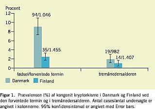 Ved fødslen (den forventede termin ved præmaturitet) fandtes kryptorkisme hos 9,0% (95% CI: 7,3-10,9) af de danske drengebørn mod 2,4% (1,7-3,3%) af de finske drengebørn (Figur 1 ). I begge lande var den hyppigste form højt skrotale testes den mildeste form (Danmark: 78%, Finland: 46%).