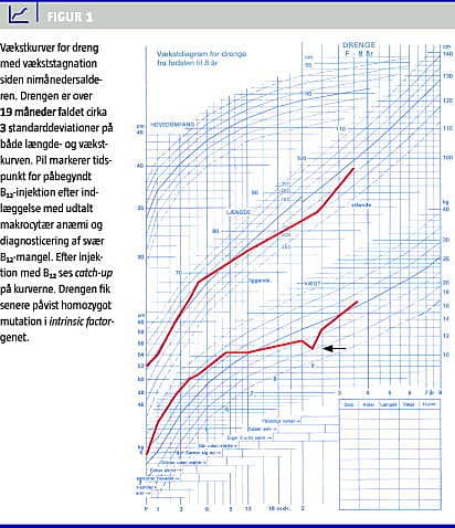 Blodprøverne korrigeredes, og barnet kom i trivsel (Figur 1). Efter start på cyanocobalamin klagede drengen over natlige benkramper. Cyanocobalamin kan give muskelømhed [1]. Man skiftede til hydroxocobalamin, og klagerne ophørte.