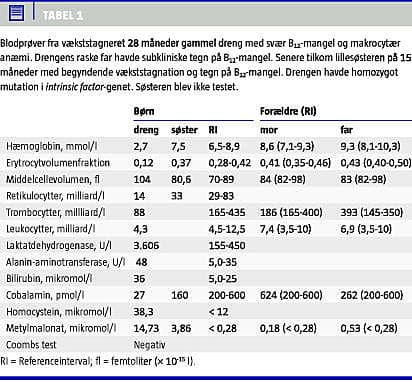 Man tog blodprøver fra begge forældre (Tabel 1). Faren, der i øvrigt var rask, havde overraskende subkliniske tegn på B12 -mangel. Gastroskopi med biopsi viste ikke noget patologisk. Mavesaft blev ikke undersøgt. Han blev herefter også behandlet med månedlige B12 -injektioner.