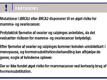 I denne statusartikel belyses det, om man efter PBSO hos BRCA1/2-mutationsbærere pga. mammacancerrisikoen kan tillade at substituere deres hormonproduktion indtil almindelig menopausealder, og hvilken type HT man skal anbefale.