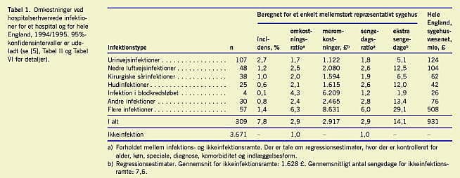 Det bedste og mest omfattende studie stammer fra England [5, 7] og er baseret på tal fra et »repræsentativt« sygehus, hvor der blev indsamlet detaljerede data i 1994/1995. Med afsæt i sygehustallene er der foretaget en opregning til nationalt niveau. Ved hjælp af regressionsanalyse blev der foretaget sammenligninger mellem resurseforbruget hos infektionsramte og ikkeinfektionsramte patienter. Der blev anvendt totalomkostninger, om end variable omkostninger også blev beregnet. Incidensen af hospitalsinfektioner var 7,8% med betydelig variation mellem infektionstyper (Tabel 1 ). De ekstra liggedage på grund af infektioner gælder antalsmæssigt utvivlsomt ikke i dag. Det samme gælder de anførte omkostningstal. Derfor er det mere relevant at hæfte sig ved forholdet mellem sengedage og omkostninger for infektionsramte og ikkeinfektionsramte, f.eks. at omkostninger for infektionsramte var 2,9 ga nge højere end for ikkeinfektionsramte.