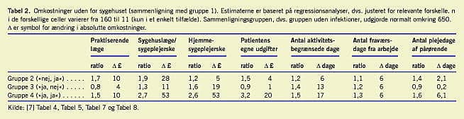 Tabel 2 sammenfatter resultaterne for de nævnte fire grupper, hvor gruppe 1 tjener som sammenligningsgruppe, og beregningen af de forholdsvise omkostninger/dage m.m. er foretaget i forhold hertil (ratio).