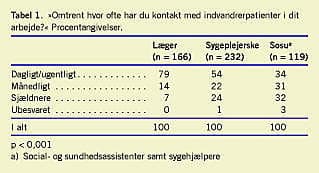 Lægerne viste sig at have hyppigst kontakt med indvandrerpatienter, således havde 79% af lægerne daglig eller ugentlig kontakt (Tabel 1 ). Blandt sygeplejerskerne havde 54% daglig og eller ugentlig kontakt med indvandrerpatienter, og blandt social- og sundhedsassistenter gjorde det sig gældende for 34% (Tabel 1).