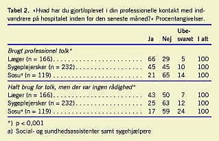 Summary Hospital staff's different attitudes and experiences with regard to immigrant patients Ugeskr Læger 2008;170(7):541-544 Introduction: The study investigates hospital staff's different attitudes and experiences with regard to immigrant patients as a basis for educational initiatives. Materials and methods: The study is based on a questionnaire to nurses, doctors and assistant nurses at Bispebjerg Hospital, a major general hospital in Copenhagen in spring 2001. Among the 1,012 persons included, the total response rate was 58%. Results: Doctors had more frequent contact with immigrant patients than nurses and assistant nurses. Doctors used interpreters more often and experienced more often the need for an interpreter when none was available. The professionals regarded it as appropriate that immigrant patients participate in the general preventive programmes, but especially doctors and nurses favoured special programmes to meet the special needs of immigrant patients. In particular nurses and assistant nurses showed interest in education within the area of migrant health. Attitudes among different health professions towards immigrants, preventive programmes and the need for further education reflect educational background, but also differences in experiences and working conditions regarding patient contact. Conclusions: There is a need for educational interventions relating to major issues such as communication and culture and to specific issues of immigrants' health and disease patterns in a global perspective. The starting point of interventions should be the specific interests and needs of the different groups of professionals.