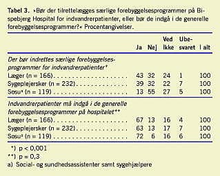 Et flertal blandt alle personalegrupper mente, at indvandrerpatienter burde indgå i de eksisterende forebyggelsesprogrammer, 63-72% svarede bekræftende på dette spørgsmål (Tabel 3 ). Størst interesse for iværksættelse af særlige forebyggelsesprogrammer udviste læger og sygeplejersker, hvor 43% af lægerne og 39% af sygeplejerskerne svarede ja til særlige forebyggelsesprogrammer for indvandrerpatienter. Blandt social- og sundhedsassistenterne svarede 13% bekræftende på iværksættelse af sådanne initiativer (Tabel 3). I argumentationen for de særlige forebyggelsestiltag blev det nævnt, at de kunne bevirke, at sproglige og kulturelle aspekter kunne imødekommes, og at indsatsen således kunne målrettes til særlige patientkategorier.